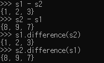 차집합은 '-' 기호나 difference 메서드로 구할 수 있습니다.