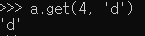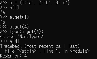 get(x) 메서드는 x라는 Key에 대응되는 Value를 반환합니다. a[x]를 사용했을 때와 동일하지만, 존재하지 않는 Key를 가지고 올려고 할 때, a[x]는 에러가 발생되며, a.get(x)는 None을 반환합니다.