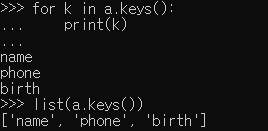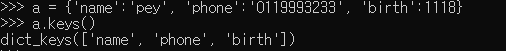 a.keys() # dict_keys(['name', 'phone', 'birth'])