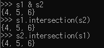 '&' 기호를 사용하면 교집합을 구할 수 있고, 또는 intersection 메서드를 사용해도 동일한 결과를 반환합니다.