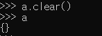 a.clear()를 사용하면 됩니다. clear 메서드는 딕셔너리 안의 모든 요소를 삭제한며, 빈 딕셔너리 { }로 표현됩니다.