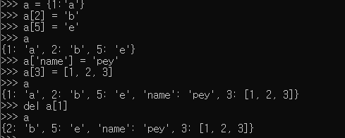 딕셔너리에 a[2] = 'b' 와 같이 입력하면 Key와 Value가 각각 2, 'b'인 딕셔너리 쌍이 추가됩니다.