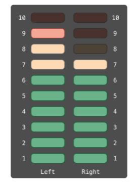아래 이미지는 오디오 채널 두 개를 결합하여 스테레오 음량 미터를 모델링하는 것을 보여줍니다. 채널의 음량 레벨이 0일 때 채널의 표시등은 켜지지 않고, 음량 레벨이 10이면 채널의 모든 표시등이 켜집니다. 이 그림에서 왼쪽 채널의 음량은 9이고, 오른쪽 채널의 음량은 7입니다.