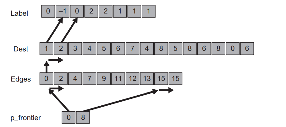 또한, 두 개의 tail 인덱스를 사용하는데, p_frontier_tail 변수는 previous frontier에 삽입된 정점의 개수를 가리키고, c_frontier_tail 변수는 current frontier에 삽입되는 정점들의 수가 저장됩니다.