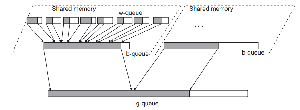 각 워프 내부의 경쟁은 아래 그림과 같이 계층에 다른 level의 큐(w-queue)를 추가하여 해결할 수 있습니다.