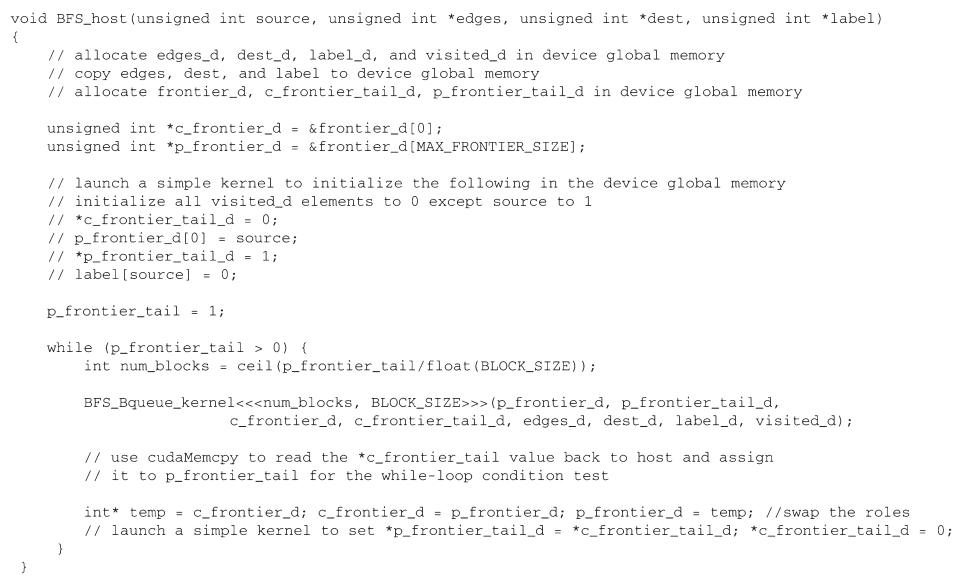 그리고 Host 코드는 디바이스 전역 메모리에 d_frontier 배열을 디바이스 전역 메모리에 할당하는데, 이는 오직 디바이스에서만 액세스되므로 host에서의 frontier 배열은 필요가 없습니다. d_c_frontier와 d_p_frontier 포인터는 d_frontier의 처음 절반과, 두번째 절반을 가리킵니다. 두 포인터의 역할은 while 루프가 끝날 때마다 서로 바뀝니다. 또한 두 frontier 배열의 크기를 나타내는 d_c_frontier_tail 변수와 d_p_frontier_tail 변수를 할당합니다.