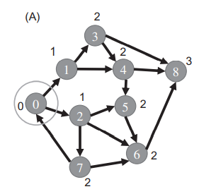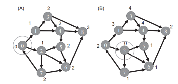 위 그림의 (B)는 정점 2를 source로 지정하고, BFS를 수행했습니다. level 1의 정점은 5, 6, 7이며, level 2의 정점은 8, 0 입니다. 정점 1만이 level 3이고, 마지막으로 정점 3, 4는 level 4입니다. 하나의 간선만큼 떨어진 정점으로 source를 옮겼는데, 그 결과는 상당히 다릅니다.