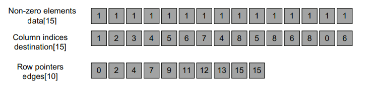 row pointer array는 edges array로 사용합니다. 간단히 설명하면, 각 row pointer는 각 row에서 0이 아닌 요소의 시작 위치를 알려줍니다. 예를 들어, edges[3] = 7은 row 3에서 0이 아닌 요소의 시작 지점을 알려주고 edges[4] = 9는 row 4의 0이 아닌 요소의 시작 지점을 알려줍니다. 이를 통해 우리는 row 3의 0이 아닌 data가 data[7]과 data[8]에 있고, 이 data의 column 인덱스가 destination[7]과 destination[8]의 값이라는 것을 알 수 있습니다.