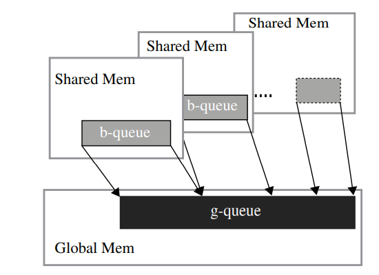 각 블록에 private한 큐를 만들어주면 큐 삽입에서의 경쟁이 크게 줄어듭니다. 다만, 커널의 마지막 부분에서 private 큐의 내용을 global 큐에 통합하는 추가적인 단계(코스트)가 필요합니다.