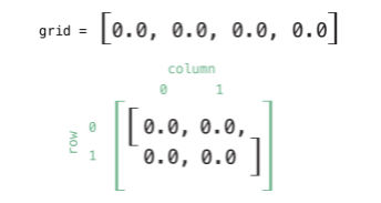 방금 생성한 Matrix 인스턴스는 2개의 행과 열로 구성됩니다. Matrix 인스턴스의 grid 배열은 행렬을 1차원으로 표현하고 있고, 다음과 같이 읽을 수 있습니다.