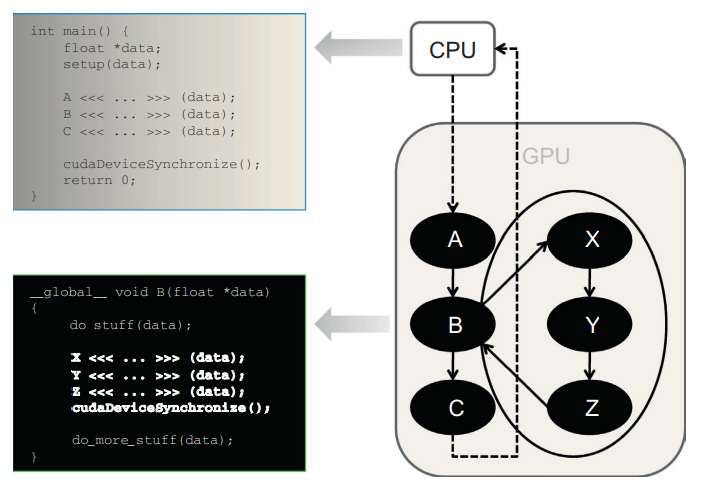 위 그림에서 main 함수(host code)는 A, B, C라는 3개의 커널을 실행합니다. 이는 기존 CUDA 모델에서 커널 실행입니다. 한 가지 다른 점은 커널 B에서 X, Y, Z라는 3개의 커널을 실행합니다. 이는 이전 CUDA 시스템에서 불가능한 것이었습니다.