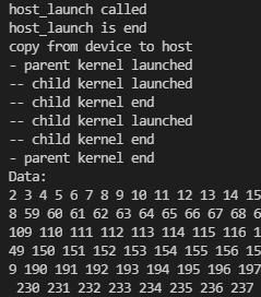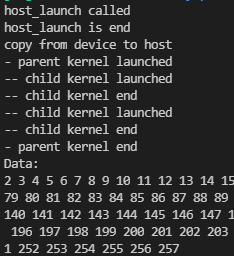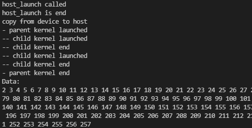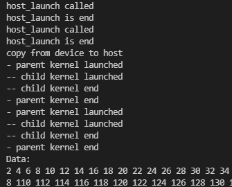 호스트 코드에서 host_launch 실행은 non-blocking이기 때문에 'host_launch called'가 출력된 이후에 바로 'host_launch is end'와 'copy from device to host'가 호출됩니다. 하지만 Data 출력은 커널 실행이 완료된 이후에 수행되는데, 이는 cudaMemcpy 함수를 시행하면 내부적으로 cudaDeviceSynchronize()의 역할을 수행하기 때문입니다. 따라서, cudaMemcpy 함수를 호출했을 때, 실행 중인 디바이스 커널이 완료된 후에 메모리 카피를 호스트에서 수행하게 됩니다.