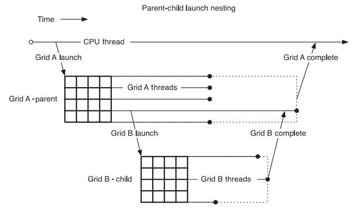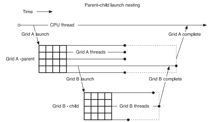 - parent 스레드에서 동기화 API 호출이 완료됨으로써 child 그리드가 완료될 때입니다. 이는 child 그리드에서의 모든 메모리 연산이 parent에서 child 그리드의 완료에 대해 동기화된 이후에 parent가 볼 수 있다는 의미입니다.