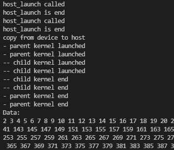 간단하게 실제로 어떻게 동기화가 이루어지는지 살펴보겠습니다. 아래 코드는 위에서 살펴본 parent_launch, child_launch 커널 함수와 host_launch 함수에 각 함수의 진입과 종료를 출력하도록 printf를 추가하였습니다.