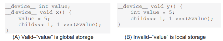 예시로, 아래의 (A)는 전역 메모리 변수에 대한 포인터를 child 커널의 argument로 전달할 때, 유효한 커널 실행을 보여줍니다. 반면, (B)는 지역 메모리(auto) 변수에 대한 포인터를 child 커널로 전달하는 유효하지 않은 코드입니다.