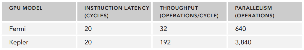 처리량(throughput)은 각 SM당 사이클 당 연산의 수로 명시되어 있고, 하나의 명령을 실행하는 1개의 warp는 32개의 명령에 대응됩니다. 따라서 최대 연산 리소스 활용을 유지하기 위해서 SM당 필요한 warp의 수는 Fermi GPU에서는 640 / 32 = 20 warps로 계산할 수 있습니다.