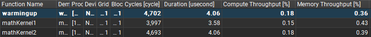 mathKernel1에서는 warp divergence가 발생하기 때문에 성능 하락이 존재하고, 따라서 mathKernel2보다 조금 더 시간이 걸리는 것을 확인할 수 있었습니다.