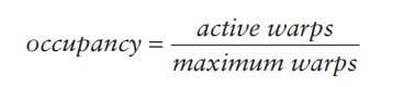 각 CUDA core 내에서 명령어는 순사적으로 실행됩니다. 하나의 warp가 stall되었을 때, SM은 다른 eligible warps를 실행하도록 switch합니다. 이상적으로는 디바이스의 Core를 계속 사용할 수 있을 만큼 충분한 warp를 가지는 것이 좋습니다. 이때, Occupancy(점유율)은 SM 당 active warps와 최대 warps 수의 비율입니다.