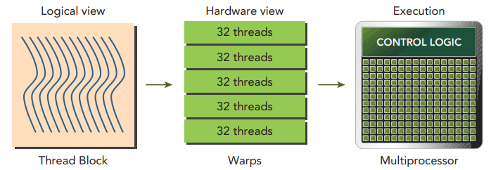 아래 그림은 스레드 블록의 논리적 관점과 하드웨어 관점 간의 관계를 보여줍니다.