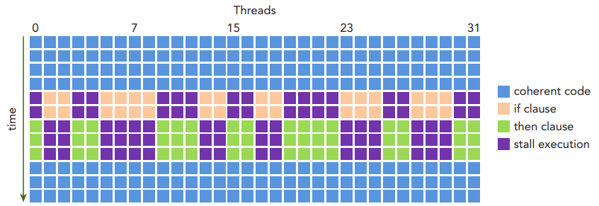 아래 그림은 warp divergence를 보여줍니다. 만약 스레드에서 조건이 true라면 이는 if clause을 실행하지만, 다른 스레드들은 이 실행이 완료될 때까지 중단됩니다.