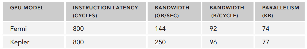 메모리 명령에서 필요한 parallelism은 메모리 latency를 숨기기 위해 필요한 사이클당 바이트 수로 표현할 수 있습니다. 아래 표는 Fermi와 Kepler 아키텍처에서의 측정분석 결과를 보여줍니다.