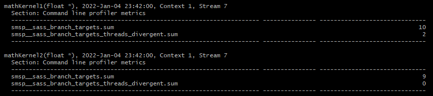 ncu.bat --metrics smsp__sass_branch_targets.sum,smsp__sass_branch_targets_threads_divergent.sum ./simpleDivergence.exe