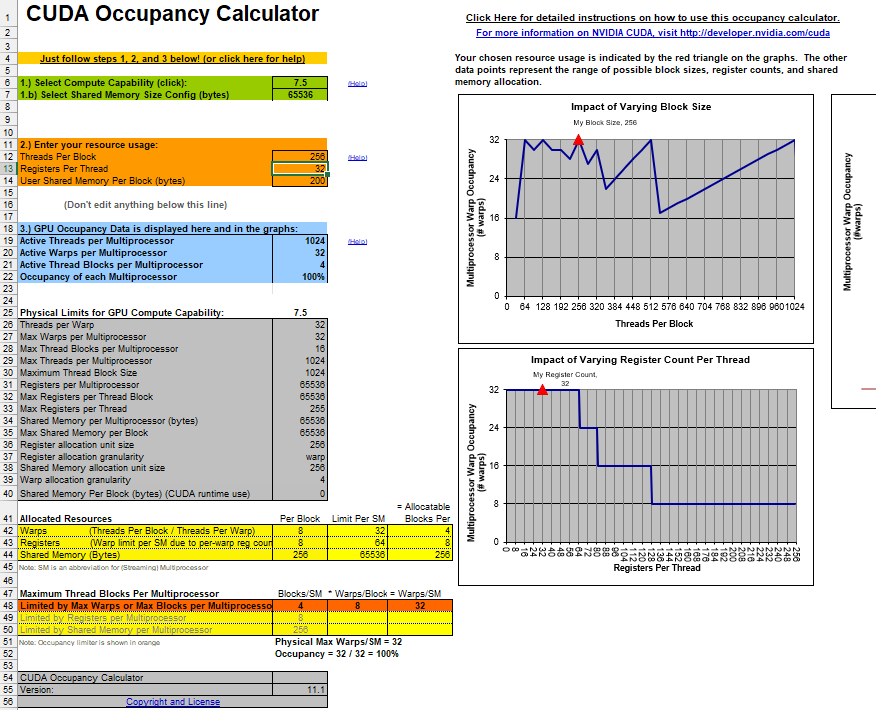 CUDA Toolkit은 CUDA Occupancy Calculator라는 엑셀파일을 포함하고 있습니다. 이는 CUDA가 설치된 폴더의 tools 폴더에서 확인하실 수 있습니다.