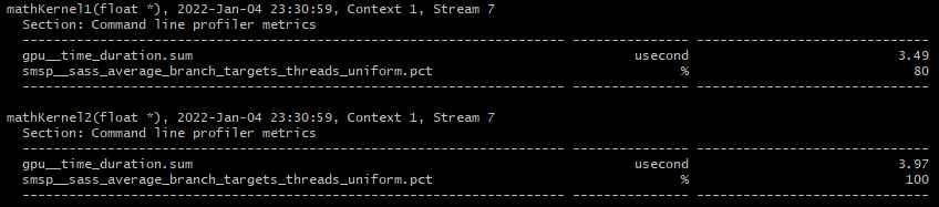 branch의 수가 이상하다고 생각이 될텐데, 이는 CUDA의 nvcc 컴파일러가 여전히 제한된 최적화를 수행하고 있다는 것을 보여줍니다. mathKernel1의 코드만 보면, 브랜치 효율이 50%가 나와야하는데, 80%로 측정되고 있습니다.