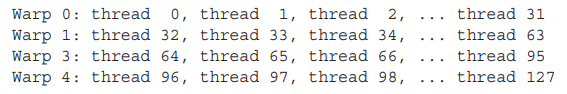 예를 들어, 128개의 스레드로 구성된 1차원 스레드 블록은 다음과 같이 4개의 warp로 파티셔닝됩니다.