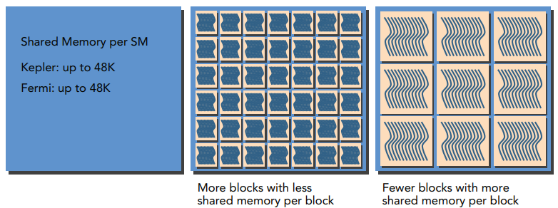 아래 그림은 스레드 블록이 더 많은 공유 메모리를 사용할 때, 더 적은 스레드 블록들이 SM에 의해서 동시에 수행되는 것을 보여줍니다.