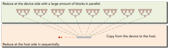 두 개의 이웃한 요소들의 거리인 stride는 처음에는 1로 초기화됩니다. 매 reduction 단계 이후에 이 거리는 2배가 됩니다. 첫 번째 단계 이후에, iData의 짝수 번째 요소들은 부분합들로 값이 변경됩니다. 두 번째 단계 이후에서는 iData의 매 4번째 떨어진 요소들이 부분합 결과로 변경됩니다. 스레드 블록간에는 동기화가 필요없기 때문에, 각 스레드 블록에서 생성되는 부분합은 host로 다시 전달되어서 이들을 순차적으로 더해주어야 합니다.