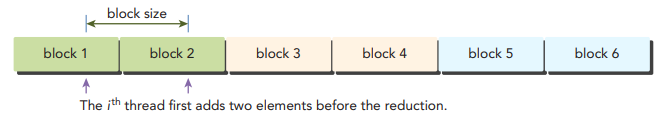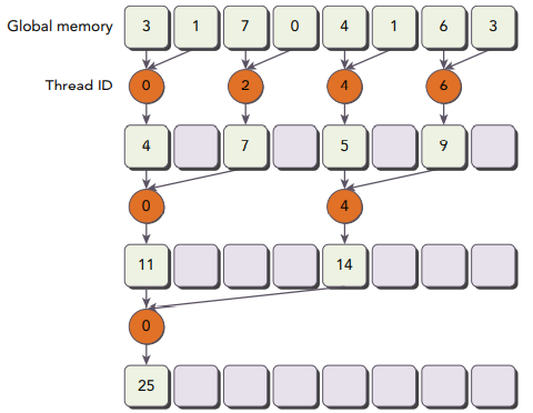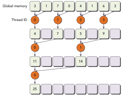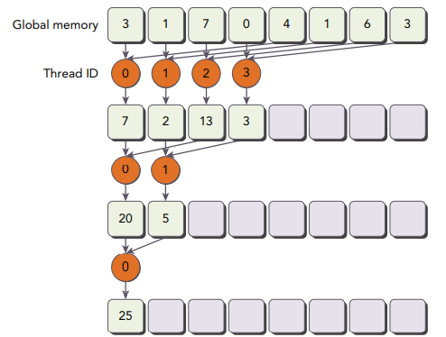 병렬 덧셈을 달성하는 일반적인 방법은 iterative pairwise implementation을 사용하는 것입니다. 하나의 덩어리가 한 쌍의 요소만을 포함하고, 스레드는 이 두 요소를 합하여 부분합을 계산합니다. 그런 다음 이 결과를 원래 입력에 다시 저장합니다. 그리고 새롭게 입력된 값들을 다음 반복에서 더할 입력으로 사용합니다. 매 반복마다 입력이 반으로 줄어들기 때문에 출력의 크기가 1이 될 때 최종합이 계산됩니다.
