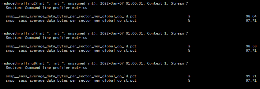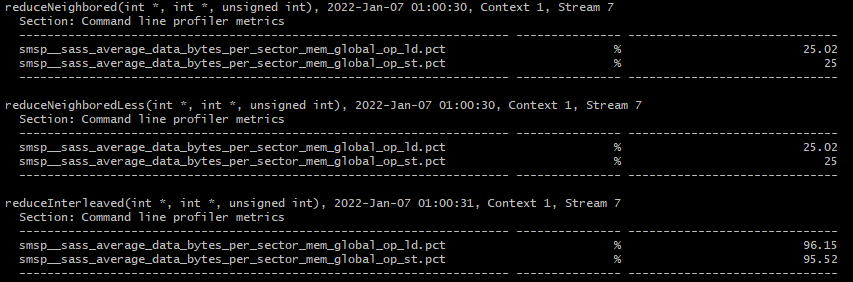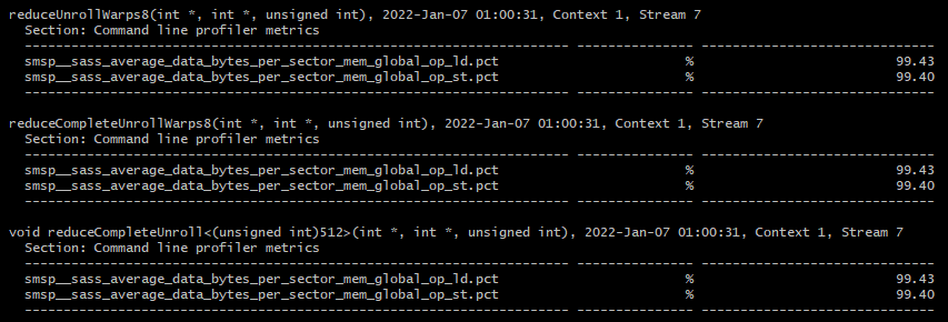 ncu.bat --metrics smsp__sass_average_data_bytes_per_sector_mem_global_op_ld.pct,smsp__sass_average_data_bytes_per_sector_mem_global_op_st.pct ./reduceInteger.exe