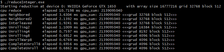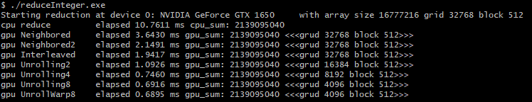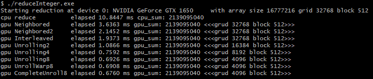 reduceUnrolling8보다 약간의 성능 향상이 존재하며, reduceNeighbored 커널보다는 약 5.3배 빠릅니다.