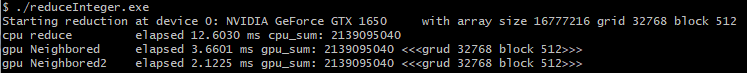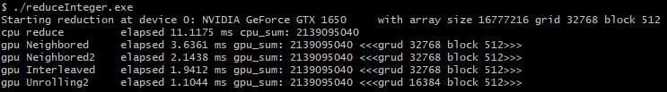 새롭게 구현한 reduceNeighboredLess 커널을 실행해보도록 하겠습니다. 마찬가지로 실행 코드는 main함수를 참조해주시기 바랍니다.