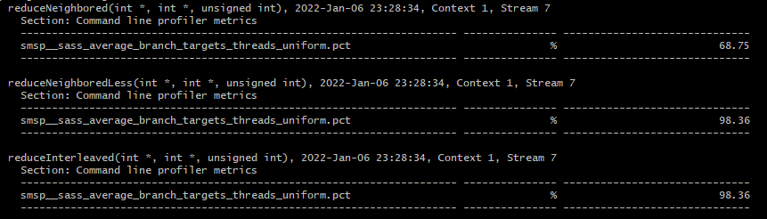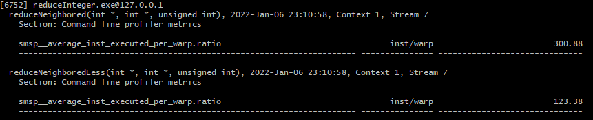 ncu.bat --metrics smsp__average_inst_executed_per_warp.ratio ./reduceInteger.exe