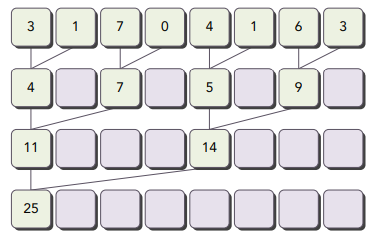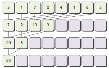 덧셈은 교환 법칙과 결합 법칙이 성립하기 때문에 배열 요소들은 어떤 순서로도 더할 수 있습니다. 이러한 이유로 다음과 같은 방법을 통해 병렬로 덧셈을 수행할 수 있습니다.