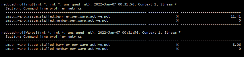 ncu.bat --metrics smsp__warp_issue_stalled_barrier_per_warp_active.pct,smsp__warp_issue_stalled_membar_per_warp_active.pct ./reduceInteger.exe