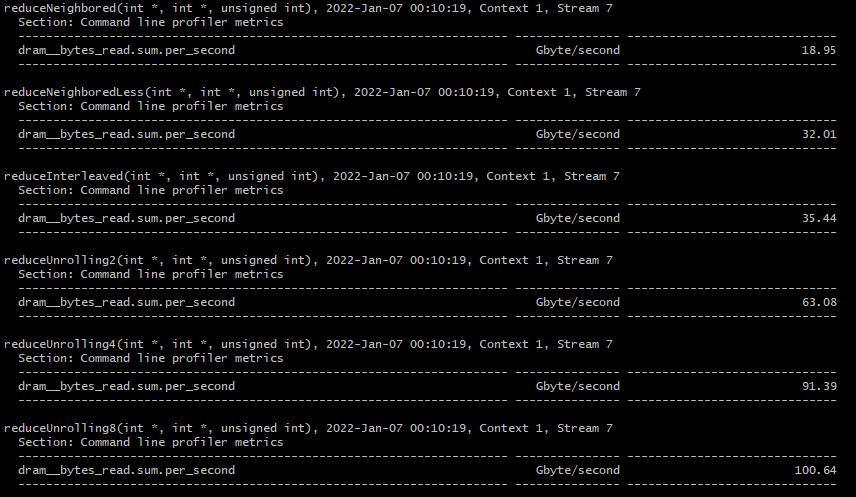 결과는 위와 같습니다. 확실히 Unrolling을 더 적용할수록 device read throughput이 증가하는 것을 확인할 수 있습니다.