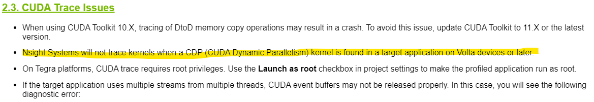 Nsight Systems으로 유사한 결과를 얻을 수 있을 것으로 예상하고, 시도해보았으나 이 역시도 불가능했습니다. Nsight System 릴리즈 노트를 살펴보면, Volta 이상의 GPU 디바이스에서는 CDP(CUDA Dynamic Parallelism) 커널을 trace할 수 없다고 합니다.