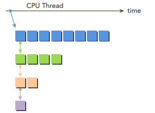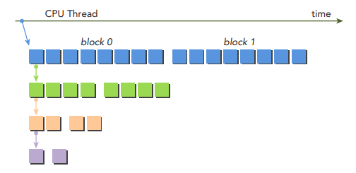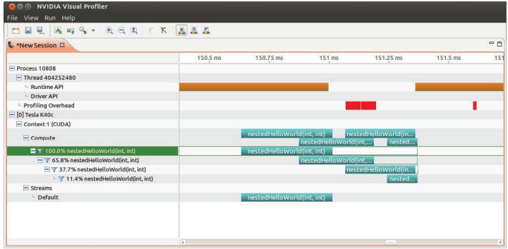 NVIDIA Visual Profiler(nvvp)를 사용하면, 아래처럼 child kernel들이 어떻게 실행되는지 Timeline으로 살펴볼 수 있습니다.