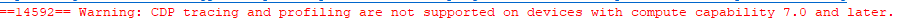 실제로 위의 결과를 살펴보고 싶어서, 여러 가지를 시도해봤으나 잘 되지 않았습니다. 제 노트북의 경우에는 compute capability가 7.5인데, Visual Profiler로 프로파일링을 하면 다음과 같은 경고가 나오면서, 제대로 결과가 나오지 않습니다.