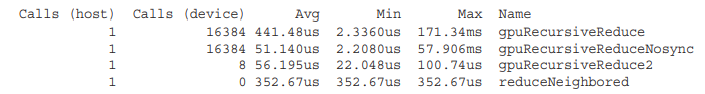 출력 결과를 살펴보면, 커널은 초기에 2048개의 블록으로 시작합니다. 각 블록은 8번의 재귀를 수행하므로, 총 16384개의 child block이 생성되며, __syncthreads로 인한 블록 간의 동기화 또한 16384번 수행됩니다. 이렇게 많은 수의 커널과 동기화는 커널 성능을 저하시킵니다.