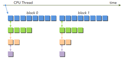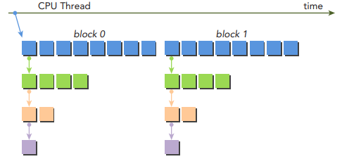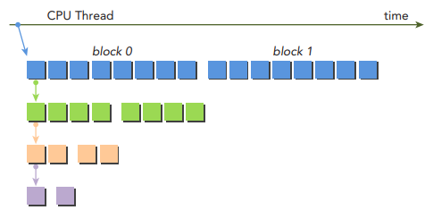 이전에 살펴본 nestedHelloWorld 커널처럼 원래 grid는 많은 block들을 포함하지만, parent에서 실행되는 모든 child grids는 parent의 thread 0에서 실행되는 하나의 블록만을 가지고 있습니다.