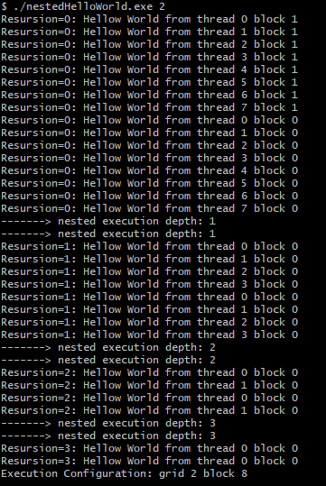nestedHelloWorld<<<1, nThreads>>>(nThreads, ++iDepth);