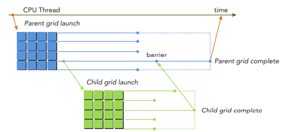아래 그림은 parent grid와 child grid의 scope를 보여주고 있습니다. parent grid는 host thread에 의해서 실행되고, child grid는 parent grid에 의해서 실행됩니다. child grid의 실행과 완료는 적절하게 nested되며, 이는 parent thread에 의해서 만들어진 child grid 전체가 완료될 때까지 완료된 것으로 간주되지 않는다는 것을 의미합니다. 만약 실행된 child grid에 대해 명시적인 동기화가 없다면, 런타임은 parent와 child 사이에 암묵적인 동기화를 보장합니다. 아래 그림에서는 barrier가 parent thread에서 설정되어, child grid와 명시적인 동기화를 수행하고 있습니다.
