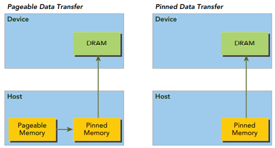 GPU에서는 host OS가 데이터를 물리적으로 이동하는 시점을 제어할 수 없기 때문에 pageable한 host 메모리에 있는 데이터를 안전하게 액세스할 수 없습니다. pageable한 host 메모리에서 device 메모리로 데이터를 전송할 때, CUDA 드라이버는 먼저 임시 page-locked 또는 pinned host 메모리를 할당하고, host 데이터를 pinned memory로 복사한 다음에 아래 그림의 왼쪽과 같이 pinned memory에서 device memory로 데이터를 전송합니다.