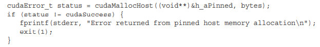 아래의 코드 일부는 error 핸들링을 포함하여 pinned memory를 할당하는 방법을 보여줍니다.