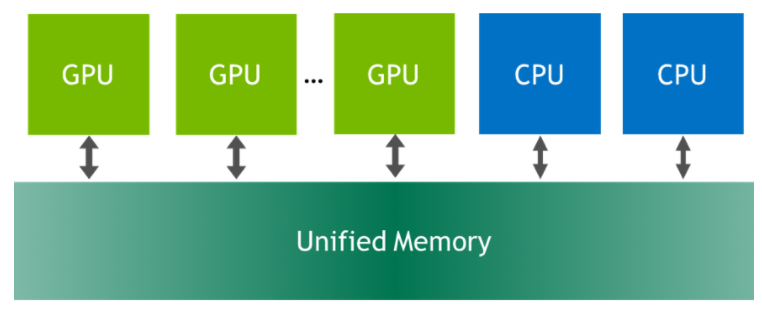 하지만 Unified Memory는 CPU와 GPU 사이에서 공유되는 managed memory pool을 생성하며, CPU와 GPU를 연결시킵니다. Managed Memory는 하나의 포인터를 사용하여 CPU와 GPU에서 모두 액세스할 수 있습니다. 핵심은 Unified Memory에서 할당된 데이터를 Host와 Device 간에 자동으로 마이그레이션하여 CPU에서 동작할 때는 CPU 메모리처럼 보이게 하고, GPU에서 동작할 때는 GPU 메모리처럼 보이게 해줍니다.