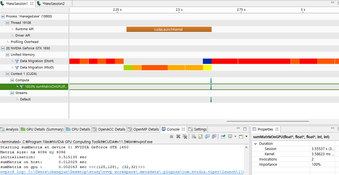 두 결과를 비교해보면, 명시적으로 데이터를 관리하는 manual.exe의 경우에는 Device To Host 전송을 한 번만 수행하지만, Unified Memory를 사용하는 managed.exe의 경우에는 두 번 수행됩니다.